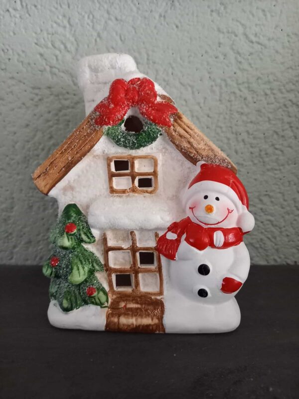 Kersthuisje, met ledverlichting, wit met Sneeuwpop en Kerstboompje, steen